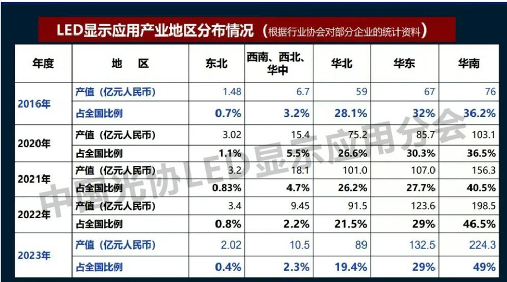 关积珍还介绍了我国LED显示应用产业地区分布情况,从表格中可以看出,东北地区产值从2016年的1.48亿元人民币增长到2023年的2.02亿元人民币,但占全国的比例却从0.7%下降到0.4%。这表明虽然东北地区LED显示应用产业有所增长,但增长速度相对较慢,占全国的市场份额逐渐减小。西南、西北、华中地区产值从2016年的6.7亿元人民币增长到2023年的10.5亿元人民币。华北地区产值从2016年的59亿元人民币增长到2023年的89亿元人民币,占全国的比例也有所下降(从28.1%下降到19.4%)。华东地区的LED显示应用产业呈现出增长势头,产值从2016年的67亿元人民币增长到2023年的132.5亿元人民币,在全国产能中占有较大的比重。华南地区的LED显示应用产业在近年来取得了显著的发展,产值从2016年的76亿元人民币增长到2023年的224.3亿元人民币,占全国的比例也从36.2%增长到49%,成为全国LED显示应用产业增长最为迅速的地区之一。关积珍指出,华南地区的LED显示应用产业产值远高于其他地区,且占全国的比例也相对较高,这表明LED显示应用产业正在向这一地区集聚,形成产业优势。